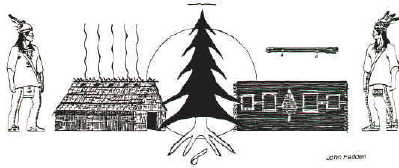 When the Chiefs decide that the people need to be reminded of the Great Law of Peace, the Hiawatha Belt is taken to the Longhouse and a reading of the belt takes place. On August 12 through the 17, 1996 at the Kahonsesne (Longhouse) of the Mohawk Nation, Jake Thomas read the Hiawatha Belt. Through this reciting to the community and through the peacemaker's symbols, the people are reminded of the tenets of the Great Law. The following illustration of the Peacemaker's symbols by John Fadden are more than mere pictures, for they are symbols that represent the laws, duties, rights, and government structure of the Haudenosaunee peoples.